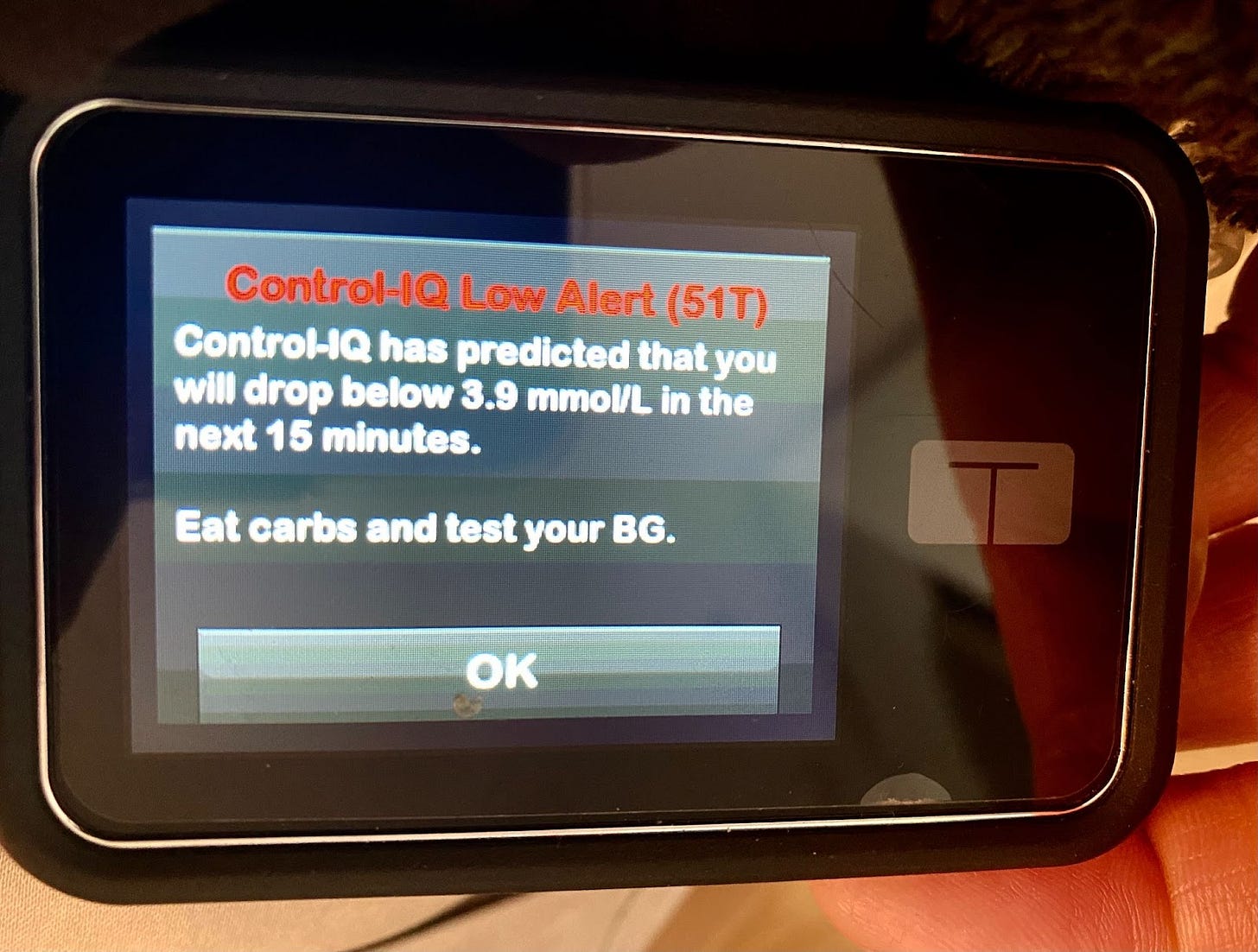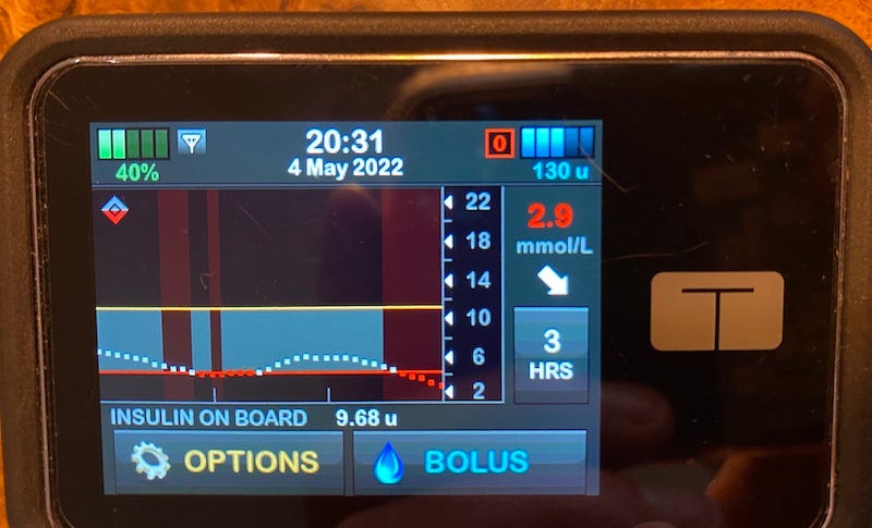 Closed loop systems are complex in their incorporation, interpretation and agency over the user. A CLID is an intimately embodied (but detachable) technology. It pierces the skin and enters the body but also includes an external device with an insulin reservoir and a screen displaying metabolic biomarkers such as BG, BG direction, insulin ‘on board’ (see photos below). All such metrics are accessible to non-users only via medical procedures. Some are for information only; others require—and occasionally demand—interpretation and action. For my argument, the combination of the pump’s computational model and the ‘contract’ the user makes with this technology allows it to control the endocrine system actively, and sometimes autonomously. It is the foundation of the CLID’s ability to deliver homeostatic balance in the absence of a functioning pancreas. It controls the ‘in-depth’ body which in turn controls our facility for normal mental functioning, perception, cognition, motricity, mood, emotional regulation and ultimately survival. At times, a CLID prompts its host’s interaction; at others, it takes control in ways that they cannot override unless they tear the technology from themselves and discard it. Users are often not even conscious of these autonomous actions. My pump often ‘takes over’ functions of my in-depth body without letting me know. In ‘user asleep’ mode, it is actively programmed to exercise control without input or notification wherever possible.