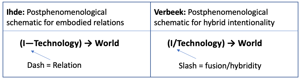 Adapting Ihde’s relational schematics, Verbeek supplements the dashes indicating relations and arrows intentionality with slashes (/) to indicate the fused basis of hybrid intentionality of, say, cochlear implants (see figure below) (Rosenberger/Verbeek 2015)